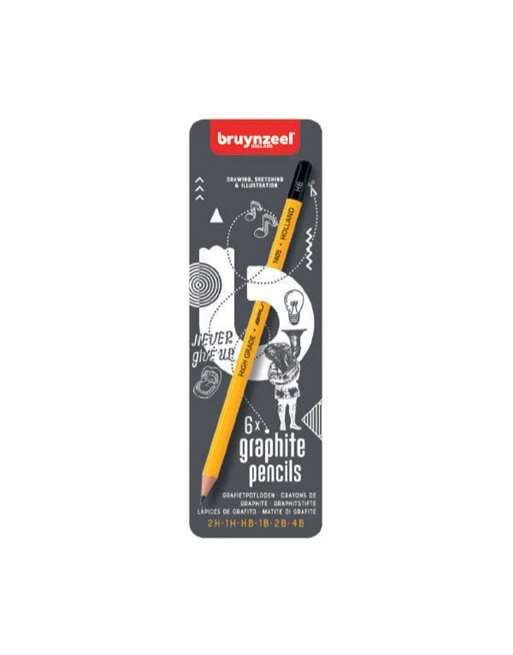 Het vertrouwde Bruynzeel High Quality schrijfpotlood, geel gelakt. In handig metalen etui met 6 verschillende hardheden. 2H, 1H, HB, 1B, 2B en 4B