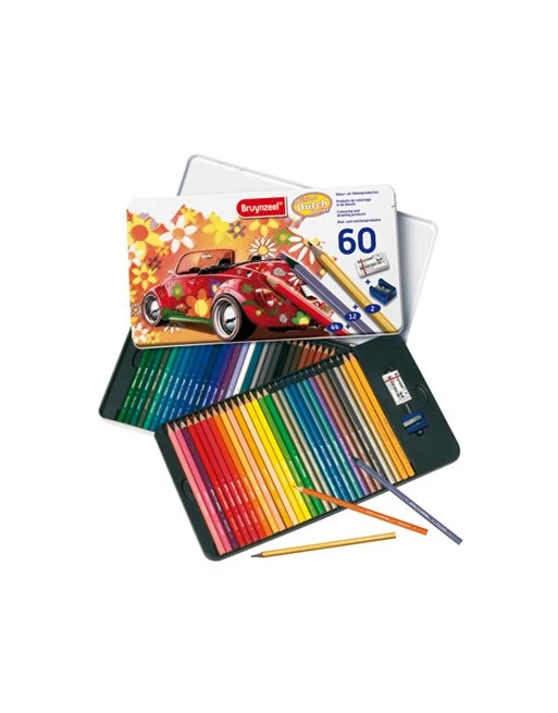 Box met 60 kleur- en tekenproducten. 44 kleurpotloden, 12 metallic kleurpotloden (zwart hout), 2 grafietpotloden, 1 gum en 1 puntenslijper.