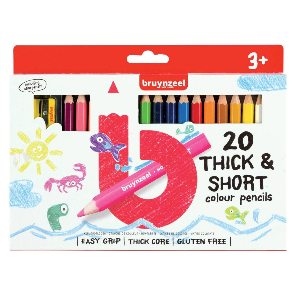 Bruynzeel Kids Korte Dikke Kleurpotloden zijn speciaal ontworpen voor kleine kinderhanden. De korte dikke kleurpotloden stimuleren de fijne motorische vaardigheden en de creativiteit. De kleurkern van de potloden is gemaakt van hoogwaardige pigmenten en is extra groot en dus ook extra sterk. In de verpakking zitten 20 kleurpotloden, inclusief puntenslijper. Geschikt vanaf 3 jaar.
