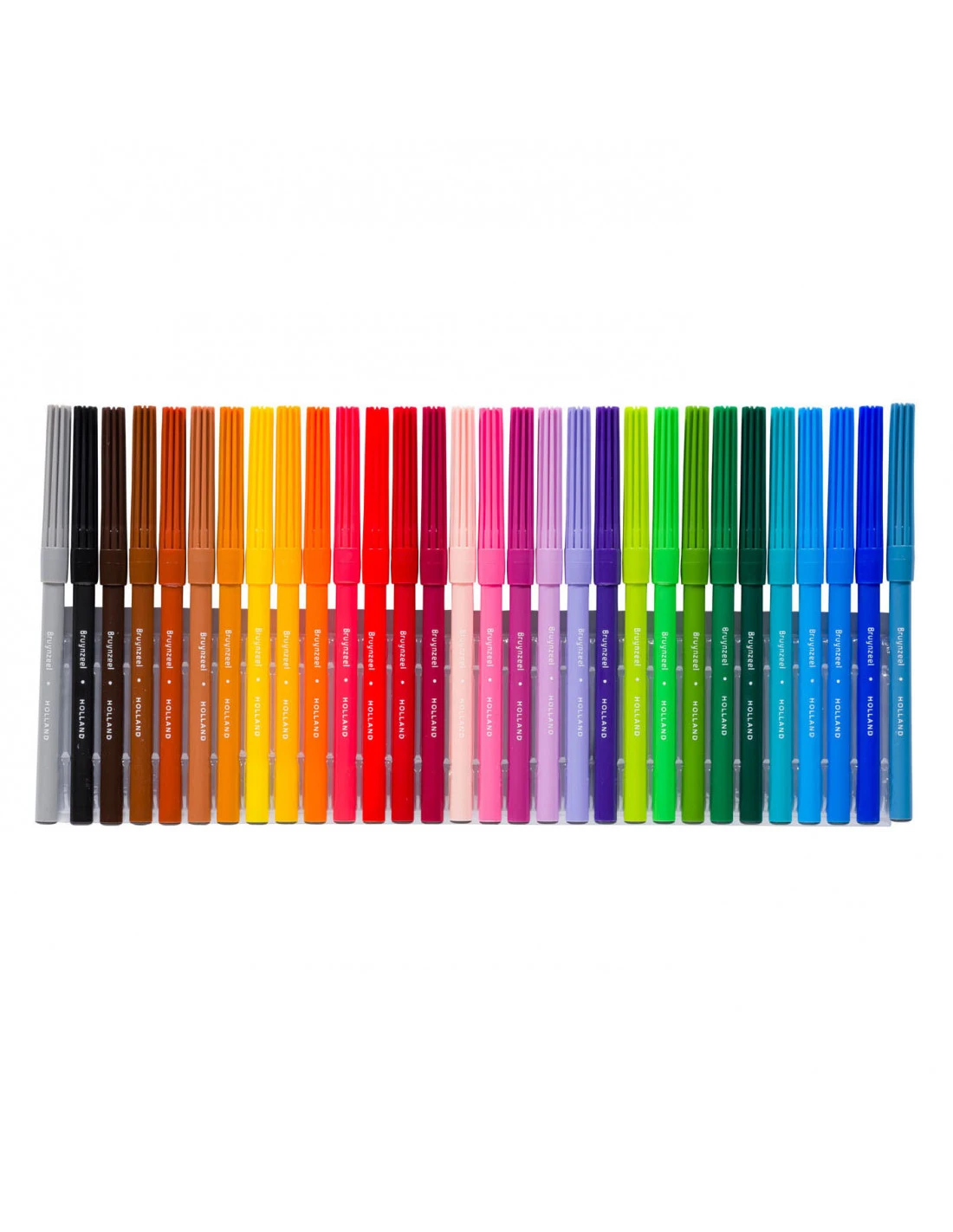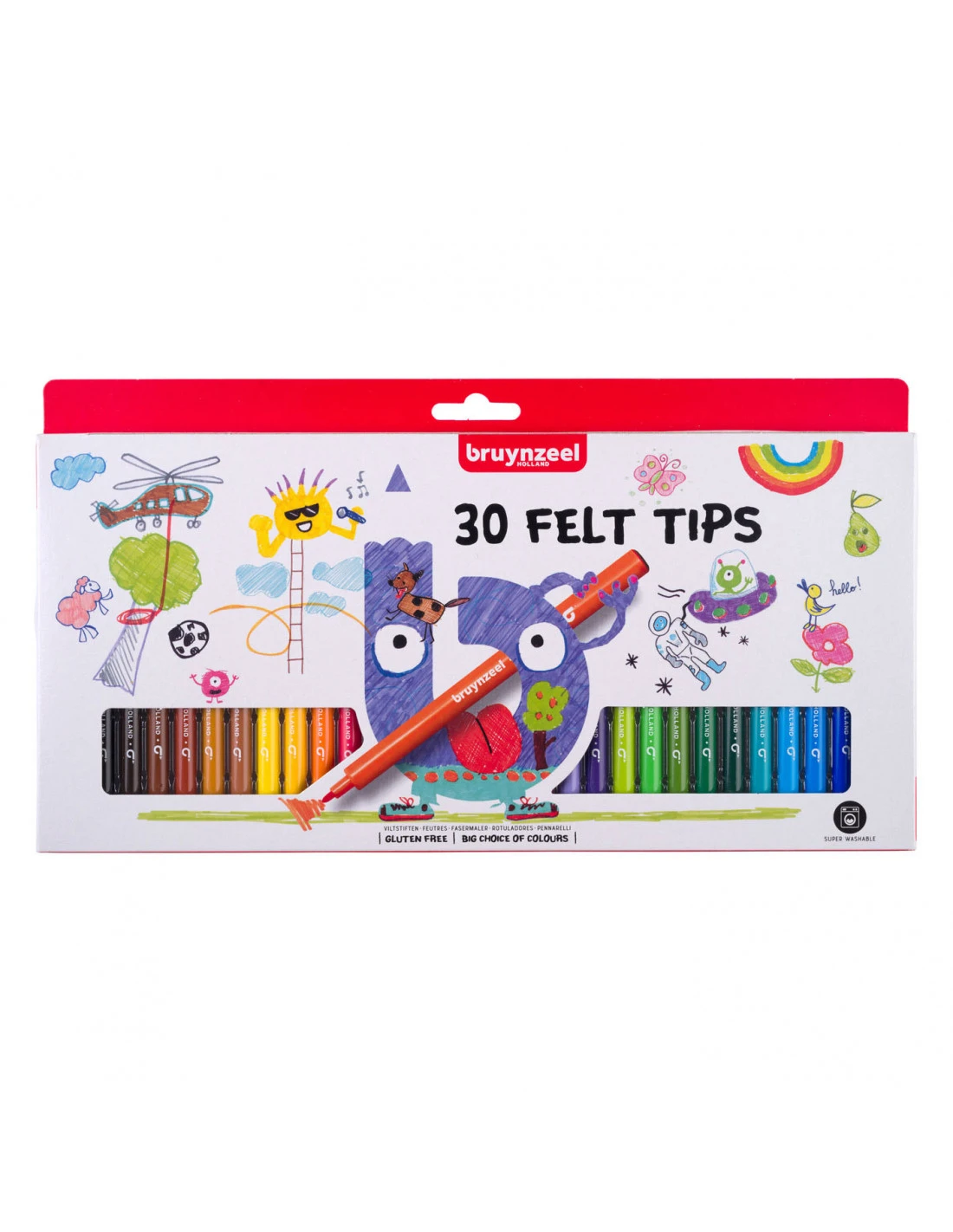 Met de viltstiften van hoogwaardige kwaliteit van Bruynzeel kun je de mooiste tekeningen maken en de mooiste kleurplaten inkleuren! Als je de stiften al een tijdje niet meer gebruikt hebt en ze een beetje uitgedroogd zijn, geef ze dan een tweede leven door ze in water te dompelen. Dankzij het plastic etui zijn de stiften gemakkelijk terug op te bergen in de kartonnen verpakking. Deze set bevat 30 verschillende kleuren viltstiften. Geschikt voor kinderen vanaf 4 jaar. Kenmerken: Goede kleurafgifte – Inkt op waterbasis – Super uitwasbaar uit de meeste textielsoorten – Glutenvrij.