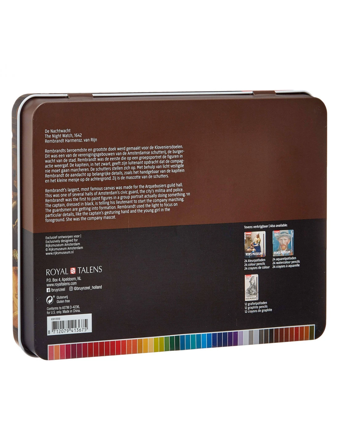 De Bruynzeel Rijksmuseum Kleurpotloden is een echt pareltje onder het vele aanbod van kleurpotloden. Het merk Bruynzeel is een samenwerking aangegaan met het Rijksmuseum wat resulteert in deze exclusieve kleurpotlodendoos met wel 50 glutenvrije kleurpotloden die vervaardigd zijn uit verantwoord verkregen hout. Op de doos is het beroemde schilderij van Vincent van Gogh te zien: de Nachtwacht.