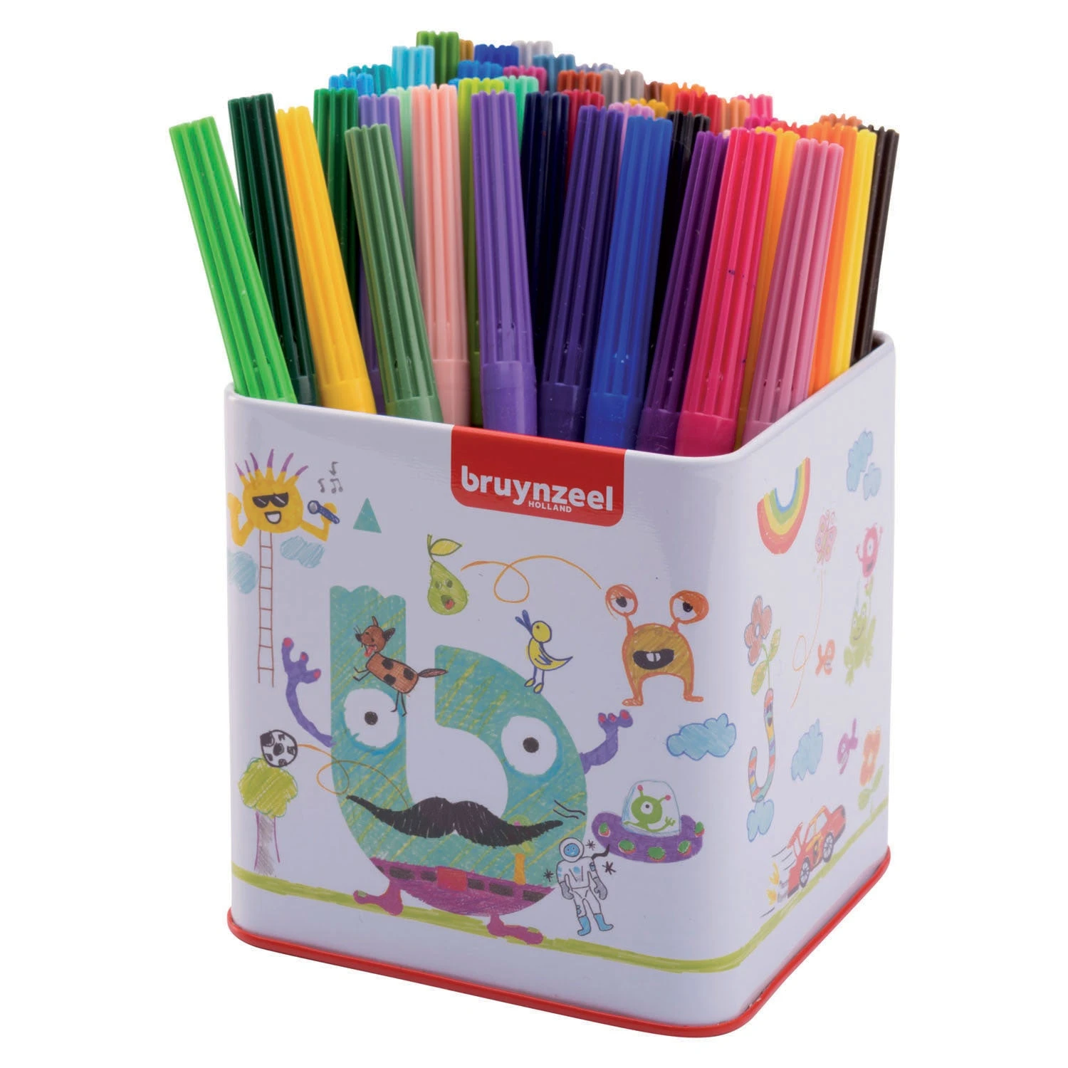 Een vrolijk blik gevuld met stiften! De 48 Bruynzeel Super Points Viltstiften zijn verpakt in een vierkante, witte koker met kleurrijke viltstift afbeeldingen. Er zitten 24 kleuren Super Points viltstiften (waarvan elk 2) in de koker.