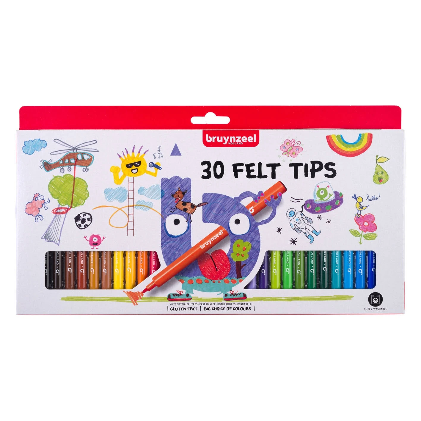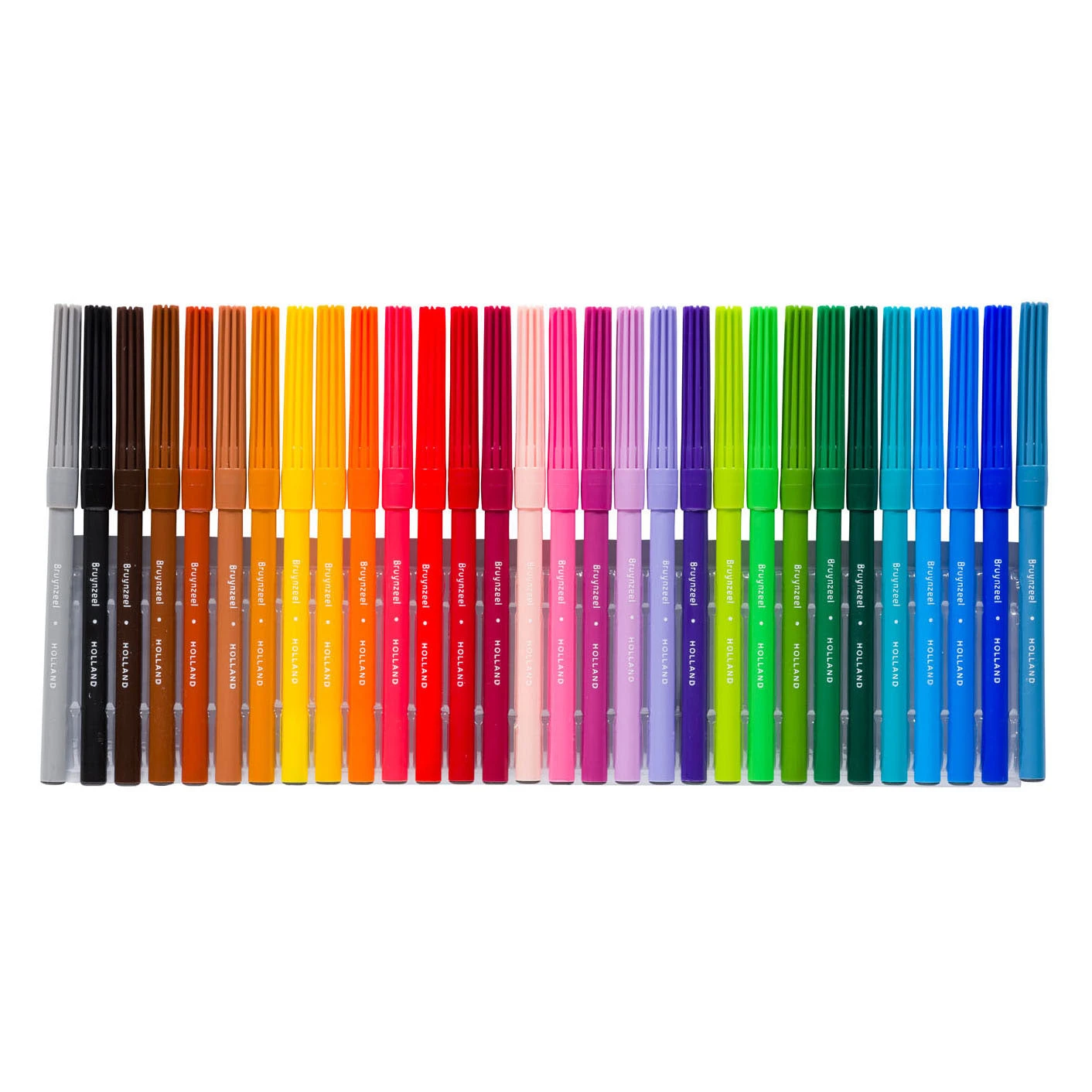Met de viltstiften van hoogwaardige kwaliteit van Bruynzeel kun je de mooiste tekeningen maken en de mooiste kleurplaten inkleuren! Als je de stiften al een tijdje niet meer gebruikt hebt en ze een beetje uitgedroogd zijn, geef ze dan een tweede leven door ze in water te dompelen. Dankzij het plastic etui zijn de stiften gemakkelijk terug op te bergen in de kartonnen verpakking. Deze set bevat 30 verschillende kleuren viltstiften. Kenmerken: goede kleurafgifte – inkt op waterbasis – super uitwasbaar uit de meeste textielsoorten – glutenvrij.Geschikt voor kinderen vanaf 4 jaar.