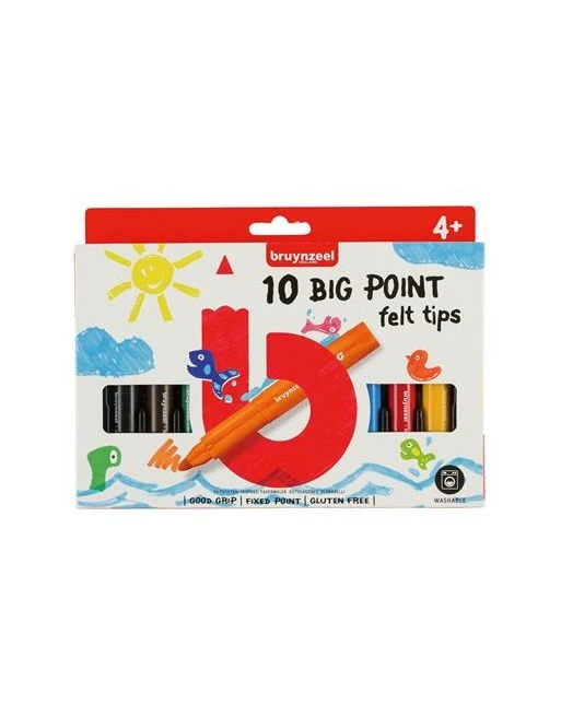 10 Bruynzeel viltstiften met extra dikke punt, speciaal ontworpen voor kleine kinderhandjes. De stiften zijn makkelijk vast te houden en extra sterk. Stimuleert de fijne motoriek. De extra dikke punt is geschikt voor het inkleuren van zowel grote als kleine vlakken. Uitwasbaar uit de meeste textielsoorten. De punt is niet indrukbaar. Specificaties: goede kleurafgifte, inkt op waterbasis en glutenvrij. Wordt geleverd in doosje. Geschikt voor kinderen vanaf 4 jaar.