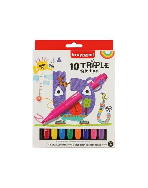 10 viltstiften van Bruynzeel met driekantige vorm, zodat kinderen de viltstift altijd op de juiste manier vastpakken. Specificaties: ergonomische driekantige grip, goede kleurafgifte, uitwasbaar uit de meeste textielsoorten en glutenvrij. Wordt geleverd in doosje. Geschikt voor kinderen vanaf 4 jaar.